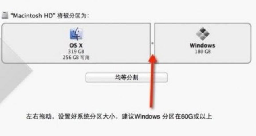 6、在這里劃分win7系統的空間大小以及mac系統空間的大小,之后,點擊“安裝”開始分區即可。