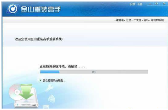 1、我們首先需要點擊打開"金山重裝高手",點擊"重裝檢測",進入環境檢測,就可以查看當前系統是否支持一鍵重裝啦。
