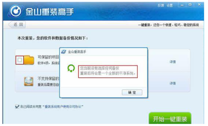 5、如果不需要備份的話,可以取消勾選,點擊“開始一鍵重裝”就可以啦。
