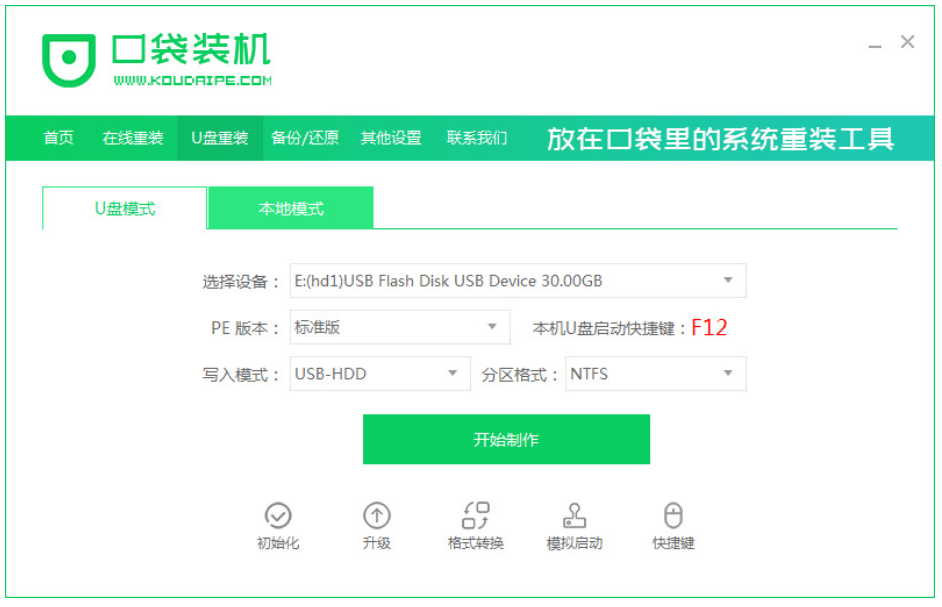 1、在電腦上下載口袋裝機工具軟件,點擊U盤重裝系統。