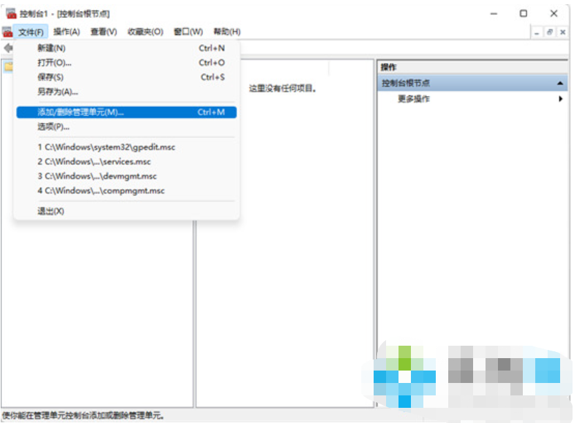 2、進入新窗口之后,點擊“文件”選項中的“添加/刪除管理單元”。