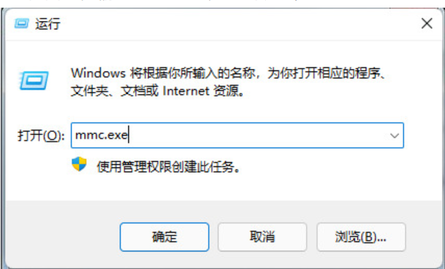 1、按下快捷鍵“win+R”打開運行窗口,輸入mmc.exe,點擊確認。
