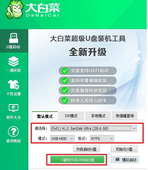 2、打開大白菜工具,插入u盤進電腦,默認設置,點擊一鍵制作啟動盤。