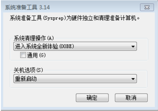 4、選擇“進入系統全新體驗(OOBE)”,同時選中“通用”復選框,再選擇“關機選項”為“重新啟動”,單擊“確定”即可。