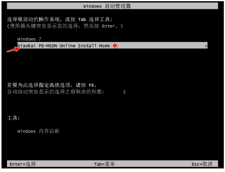 3、當進入到開機選項界面,我們選擇第二項xiaobai-pe系統按回車鍵進入。