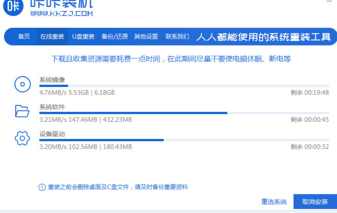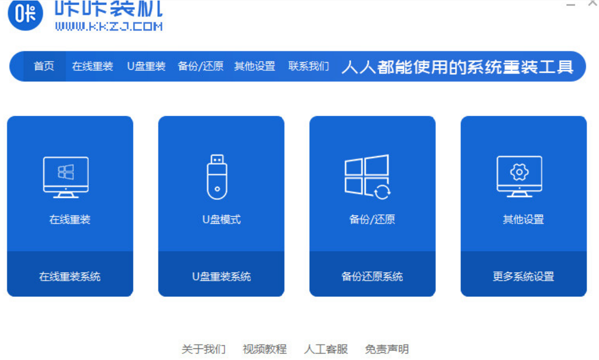 1.首先我們打開【咔咔裝機】工具,在頁面中點擊【在線系統重裝】功能進入到新的頁面。