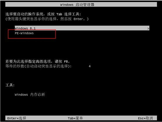 5. 系統文件下載成功后重啟電腦,在啟動管理器界面中選擇 “PE-windows”進入頁面。