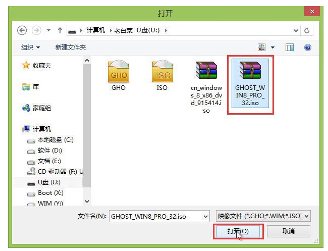 3、接著打開之前存放在制作好的老白菜u盤啟動盤中的ghost win8系統鏡像包,點擊“打開”。