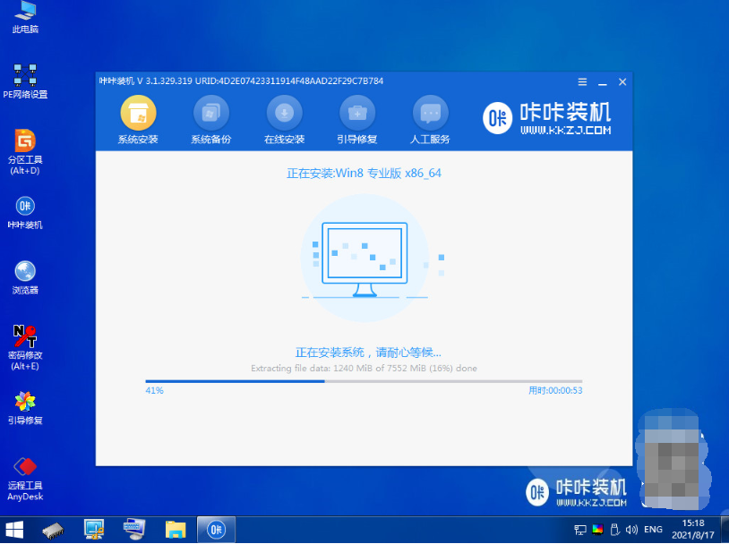 5、在pe系統桌面打開咔咔裝機工具,選擇win8系統點擊安裝到系統盤c盤,安裝完成后重啟電腦。