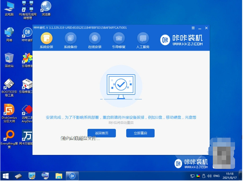 4、咔咔裝機工具自動安裝win8系統,安裝完成后自動重啟電腦。