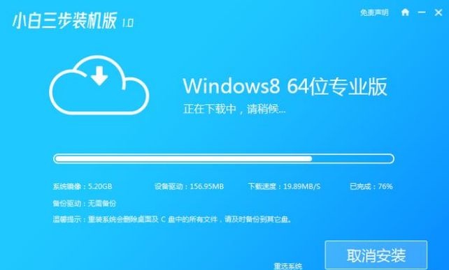 1、下載好的小白三步裝機版軟件,打開軟件后,選擇win8系統,點擊立即重裝。