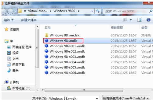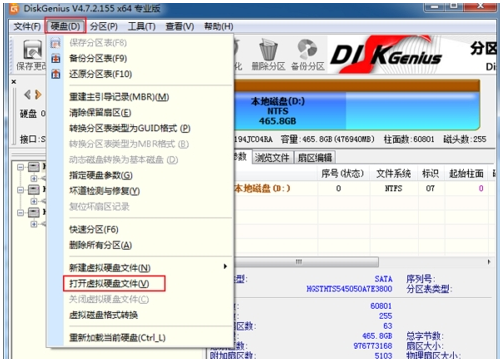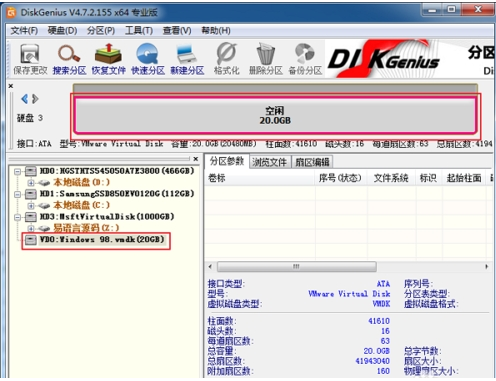 3.打開 diskgenius破解版本單擊硬盤D,單擊打開虛擬硬盤文件(V);選擇上面我們 新創建好的虛擬機Windows 98系統.選擇;Windows 98.vmdk,點擊打開即可。