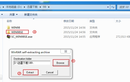 1.我們首先將win98系統下載到非系統盤當中,將其進行解壓,解壓后有兩個 版本98 文件,其中一個就行,98 SE是98的升級版。