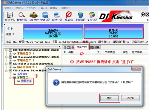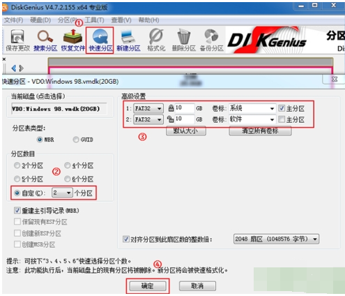 4.單擊快速分區,自定(C): 2個分區 -->高級設置 ;分區類型設置為 Fat32 (重點) --> 點擊 ;確定; -->把我們解壓的 WIN98/SE 任意拖拉一個到D盤 后,單擊是。