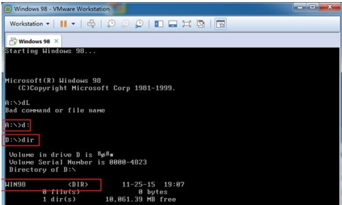 8.電腦自動重啟后,輸入: ;D:; --> 按鍵 ;回車; 切換分區。在輸入: ;dir; --> 按鍵 ;回車; 查看 當前目錄 有什么文件:看到 d盤分區。下面有個 win98 目錄如果Diskgenius下面復制進去的是win98 SE就會看到SE的哦。