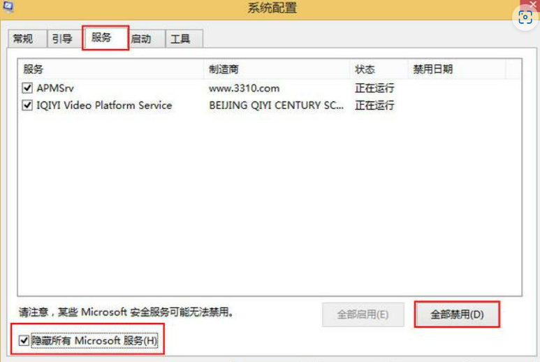 3、切換到服務項,點擊“隱藏所有Microsoft服務”,點擊“全部禁用”。