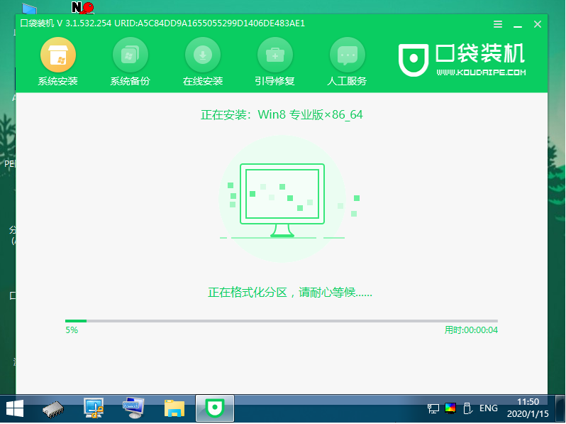 4、在pe系統內,口袋裝機工具自動打開安裝win8系統。