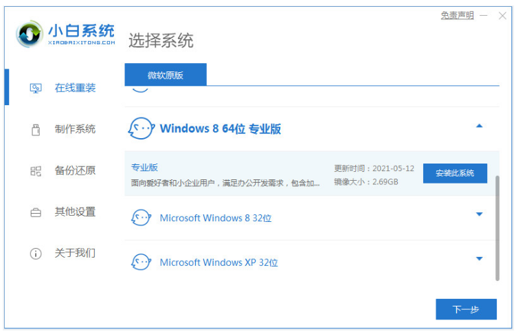 1、先在電腦上下載安裝小白一鍵重裝系統工具,打開之后在線重裝欄目選擇win8系統,點擊下一步。