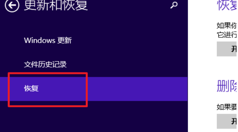 4、點擊更新和恢復后,會有WINDOWS更新,文件歷史記錄和恢復的選項,點擊恢復。