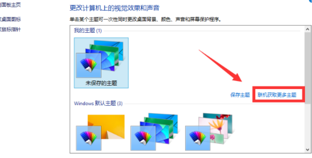 1、在桌面空白處右擊,選擇打開“個性化”,然后在“個性化”面板找到“聯機獲取更多主題”并點擊;