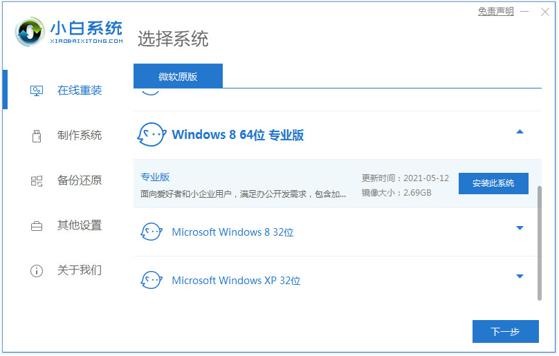 在聯想ThinkPad T510電腦上安裝打開小白一鍵重裝系統工具,選擇win8系統,點擊安裝此系統。(官方下載入口:小白系統官網)