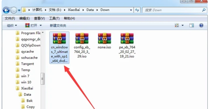 2、在E盤內依次鼠標點擊XiaoBai/Data/Down,接著找到壓縮文件大小最大的那個小白系統下載的鏡像文件。