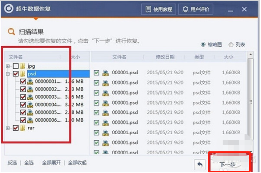3、你可以選擇掃描指定的文件格式。掃描之后會將能夠恢復的文件羅列出來。點擊“下一步”。