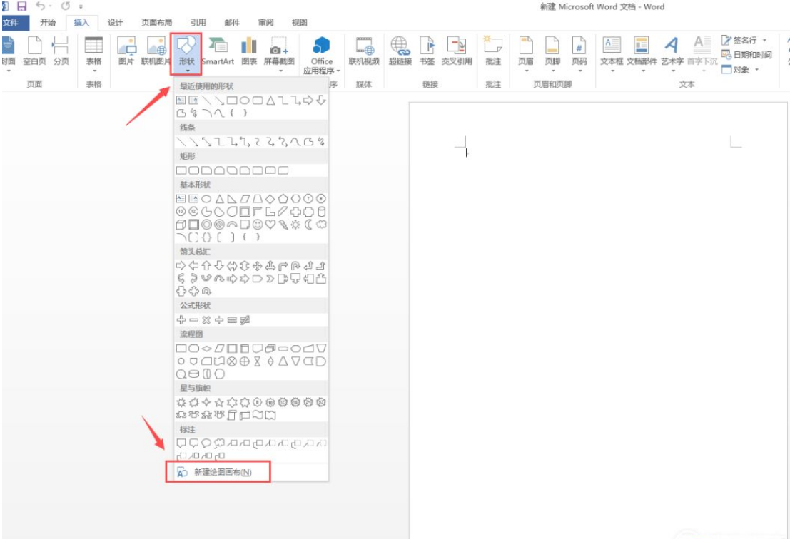 2、點擊插入之后,在下方的面板上有很多選項,這里點擊【形狀】,接著就會彈出菜單欄,其中包括線條、矩形、基本形狀、箭頭匯總、公式形狀、流程圖、星與旗幟、標注。點擊最后的【新建繪圖畫布】。