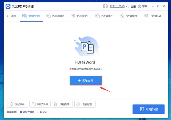 1、打開風云轉換器軟件進入編輯界面,點擊左上角“PDF轉文件”板塊,選擇PDF轉Word模式,再單擊屏幕中間出現的藍色按鈕“添加文件”,尋找需要轉換的PDF文檔。