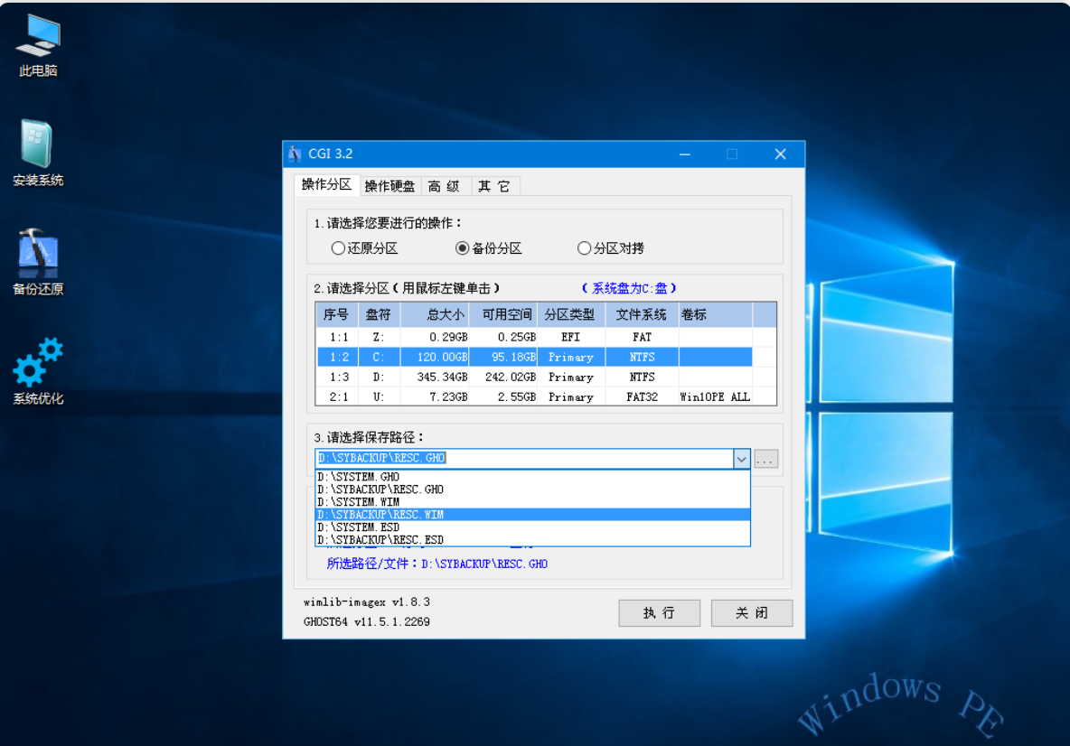 系統備份還原有許多的方法,在這個PE上可以用于備份的方法是dism(WIM )、CGI )、gho、WIM、ESD )。 恢復方法為dism(WIM )、CGI )、gho、WIM、ESD等)、WinntsEtup )、WIM )。 上圖為CGI的備份恢復。 使用它,可以備份和恢復的格式很多,速度很快。 WIM格式可以進行增量備份。 也就是說,一個備份有多個還原點。