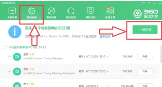 鼠標點擊工具欄的”驅動安裝“,勾選待更新或安裝的驅動,點擊”一鍵安裝“即可。