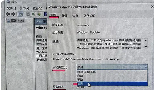 4、常規菜單下,啟動類型,選禁用;服務狀態,選停止。