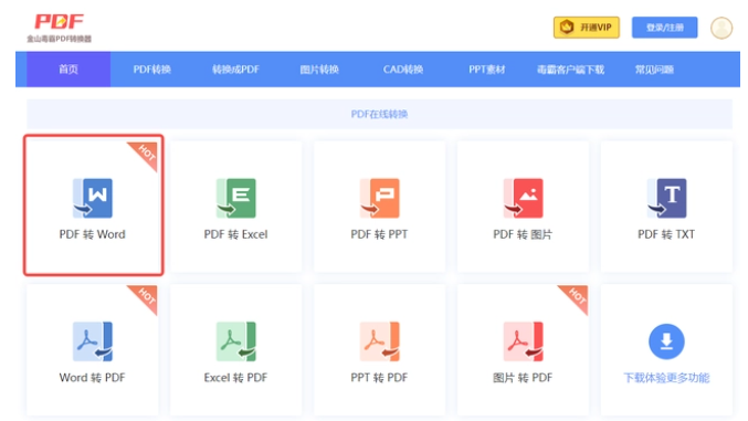 如果不想安裝新軟件,那么金山毒霸pdf在線轉換器就是非常實用的了,支持在線轉換,無需安裝,在網頁上就可以輕松完成PDF轉Word的處理。首先在瀏覽器中打開“金山毒霸PDF在線轉換器”,進入后能看到有各種轉換功能,選擇進入“PDF轉Word”,按照提示上傳PDF文件,等待格式轉換完成就可以選擇下載到自己的電腦上。