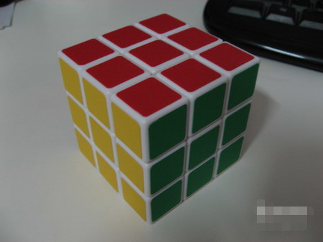 5、四側面最上面一層的中間的方塊與中層的中心塊相對應??谠E是:條件:找四側面唯一面可以對上的,并以這面為“前”,其它面對不上。(如果有兩面能對上,就用一次下面的口訣,就可以達到用口訣的條件了)右加,上加,右減,上加,右加,上加180度,右減。