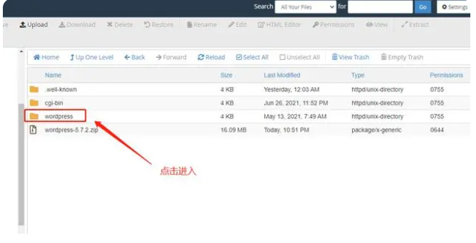 3、找到 public_html 文件下方對應的你剛才解析的域名子文件,將wordpress安裝包上傳。
