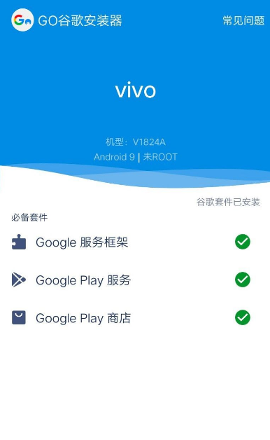 2、下載安裝好后點擊打開軟件,軟件會自動檢測手機是否安裝過谷歌套件,如果沒有安裝的話則會提示你下載安裝,安裝過程中比較慢,耐心等待一會,最終安裝成功將會如下圖所示。